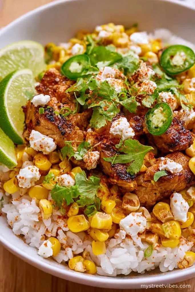 Alright, let me tell you—this is not fancy restaurant food; this is ‘I got home late and need something more exciting than plain rice’ food. Street Corn Chicken Rice Bowl…
