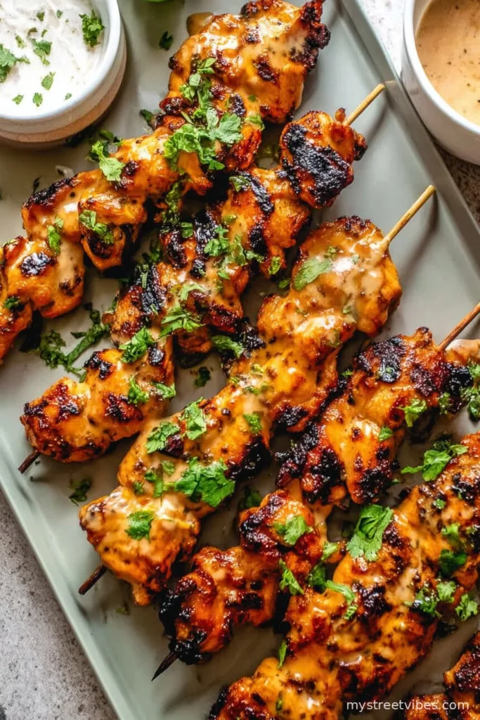 I like to pile these on a big platter with a tiny bowl of extra sauce (for those who like it messy). My sister insists on a side of sticky jasmine rice and cucumber salad — it’s a bit of a tradition now. Also, I think they’re quietly amazing tucked into flatbreads with a handful of crunchy lettuce. Sometimes we just stand around the kitchen, skewers in hand, chatting about who’s got whose charger. It’s low-key one of my favorite weeknight things.