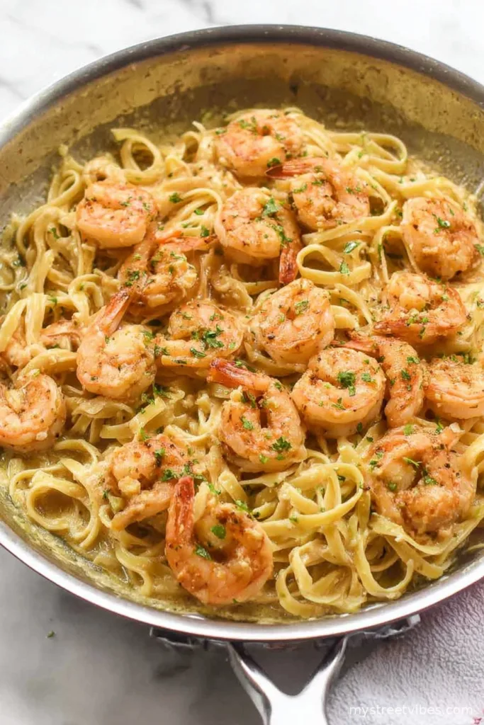 5Add the cooked shrimp and pasta to the skillet, tossing well to coat with the creamy garlic sauce. Adjust seasoning with additional salt and pepper if needed.