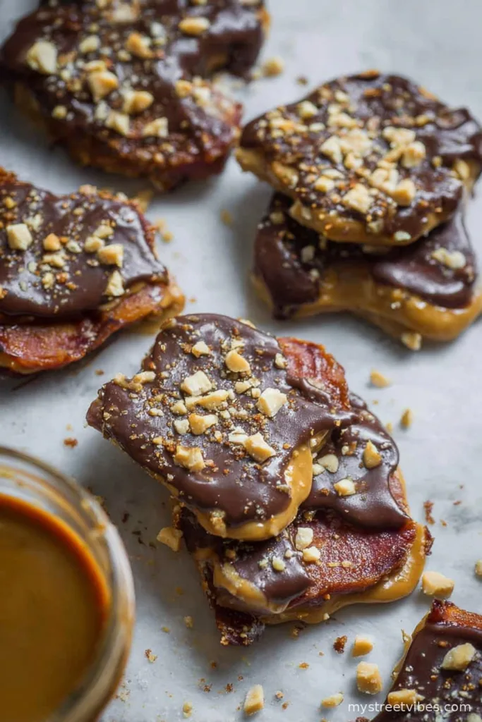 - Scatter chopped peanuts over the top, pressing them in lightly so they stay put. If they roll off, just pop ’em back into the peanut butter glue.