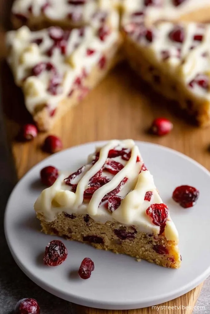 6Sprinkle chopped dried cranberries on top and drizzle with melted white chocolate. Allow frosting to set before cutting into bars and serving.